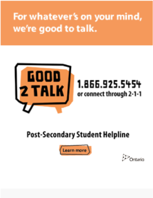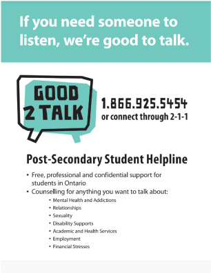 Good2Talk provides free materials that make it easy to promote the helpline on campuses across Ontario and in your community.
